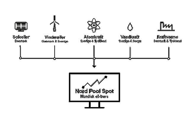 Den el, der produceres, handles på den nordiske el-børs Nord Pool i en slags døgncyklus: Først oplyser systemansvarlige i hele Norden, hvor stort udbuddet er for det kommende døgn. Herefter sender el-selskaberne deres købsbud ind, og el-producenterne sætter deres el til salg. Nord Pool matcher så købs- og salgsbud og fastsætter priser for det kommende døgn under hensyntagen til den faktiske kapacitet (udbuddet). På den måde når vi frem til selve prisen på el, afregnet per kWh. Hvis din virksomhed har en fastprisaftale, afspejler el-prisen på jeres regning naturligvis ikke den reelle markedspris.