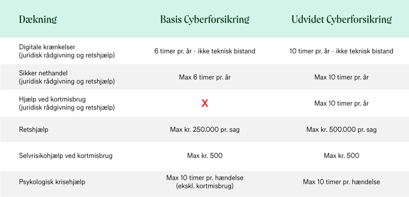 Med Udvidet Cyberforsikring får du, udover dækningerne fra Basis Cyberforsikring, også hjælp ved kortmisbrug – som fx at begrænse skadeomfanget af økonomisk tab og håndtere dialogen med banker og institutioner. Derudover indeholder Udvidet Cyberforsikring et større omfang af juridisk rådgivning og retshjælp.