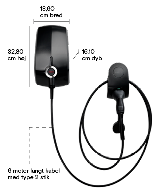 Ladeboksen, der følger med vores ladeløsning, er en fiks lille sag. Faktisk er den en af de mindste på markedet. Den lille størrelse og det medfølgende ladekabel på hele 6 meter (type 2 stik), gør det nemt at placere ladeboksen lige der, hvor du gerne vil have den.